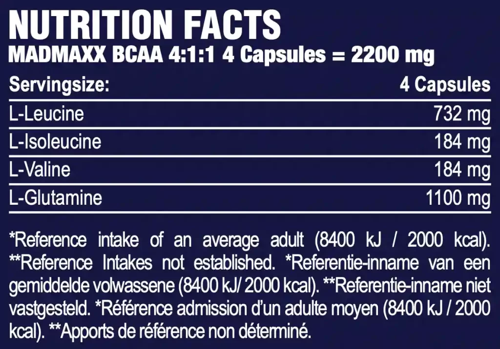 Unleash the power of maximum dosage with FAST FORWARD NUTRITION MAD MAXX BCAA 4:1:1 – 120 CAPS. In convenient capsule form, this BCAA supplement with a 4:1:1 ratio and added L-Glutamine is designed for maximum effect in achieving your Fast Forward Goals. Each serving of 4 capsules (2200 mg) packs a punch with 732 mg L-Leucine, 184 mg L-Isoleucine, 184 mg L-Valine, and 1100 mg L-Glutamine. Ideal for recovery, MAD MAXX BCAA is your choice for optimal performance.
