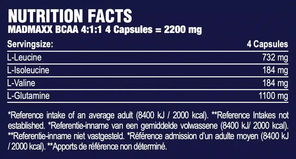 Unleash the power of maximum dosage with FAST FORWARD NUTRITION MAD MAXX BCAA 4:1:1 – 300 CAPS. In convenient capsule form, this BCAA supplement with a 4:1:1 ratio and added L-Glutamine is designed for maximum effect in achieving your Fast Forward Goals. Each serving of 4 capsules (2200 mg) packs a punch with 732 mg L-Leucine, 184 mg L-Isoleucine, 184 mg L-Valine, and 1100 mg L-Glutamine. Ideal for recovery, MAD MAXX BCAA is your choice for optimal performance.